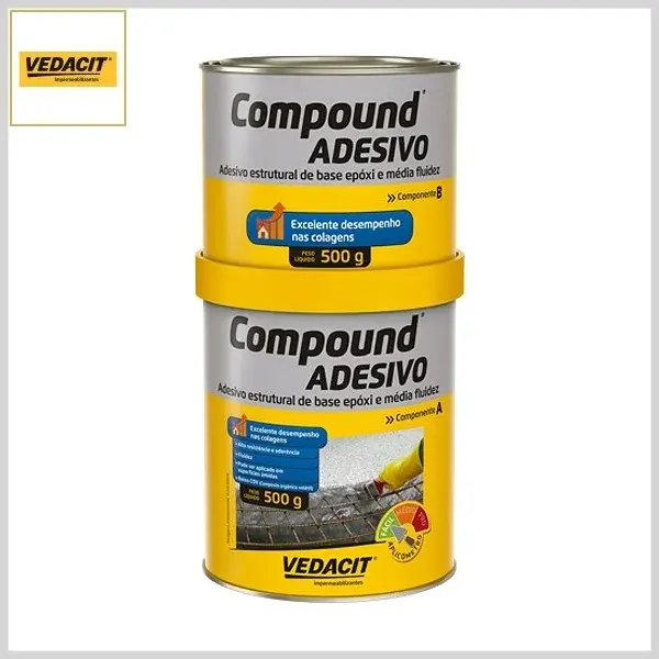 Compound Adesivo é um adesivo estrutural de base epóxi que apresenta altas resistências em baixas idades, possui média fluidez e possibilita grande facilidade no manuseio. Proporciona alto rendimento e excelente aderência a vários tipos de substratos. Oferece ótima resistência a água, óleos, graxas e meios agressivos. Pode ser aplicado em superfícies úmidas desde que não encharcadas. Apresenta resistência inicial em 24 horas e resistência máxima em 7 dias após a aplicação.