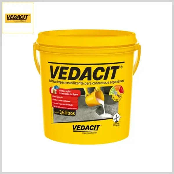 Vedacit é um aditivo impermeabilizante para concretos e argamassas, que age por hidrofugação do sistema capilar e permite a respiração dos materiais, mantendo os ambientes salubres.