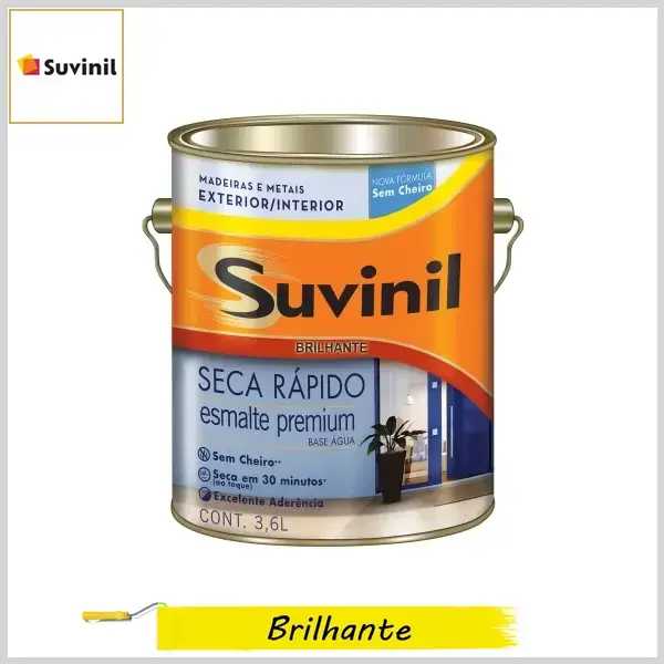 Esmalte Suvinil Base Água Seca Rápido para pintura de multimetais, madeira e alvenaria (repintura) é um produto de secagem rápida, fácil aplicação bom alastramento e aderência. Oferece resistência a fungos, além de não amarelar. É a base de água, oferecendo baixo odor e grande facilidade na limpeza, já que dispensa o uso de aguarrás, também dispensa o uso de fundo em alumínios e galvanizados.