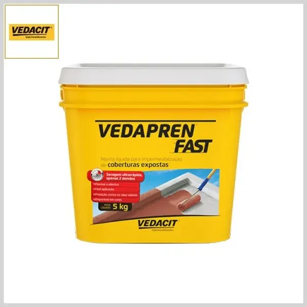 Vedapren Fast é uma manta líquida, de base acrílica, secagem ultrarrápida e aplicação a frio sem emendas, pronta para uso e moldada no local. Com alto rendimento, cobre a estrutura com uma proteção impermeável e apresenta ótimas características de elasticidade, flexibilidade e aderência, tendo uma grande durabilidade e alta resistência a intempéries. Proporciona um excelente acabamento, além de refletir os raios solares, o que reduz parte do calor absorvido pela estrutura. VEDAPREN FAST dispensa proteção contra os raios solares.