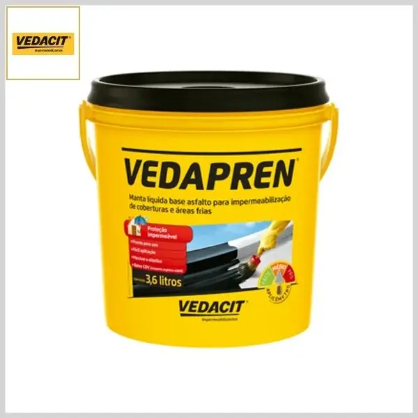 Vedapren é uma manta líquida, de base asfalto elastomérico e aplicação a frio sem emendas, pronta para uso e moldada no local. Cobre a estrutura com uma proteção impermeável e apresenta ótimas características de elasticidade, flexibilidade e aderência, tendo uma grande durabilidade.