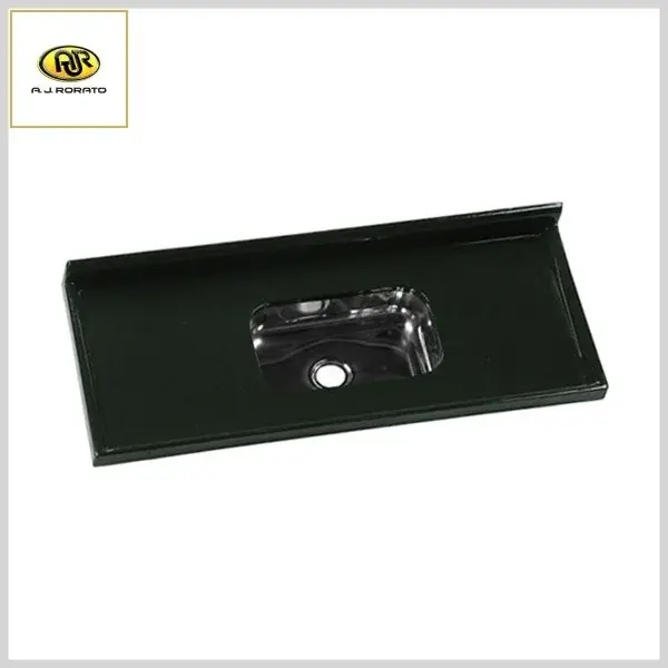 Produto em mármore sintético com espessuras reforçadas, com cobertura granitada de gel coat e com brilho e resistência incomparáveis. Superfícies mais lisas e sem porosidade, proporcionam maior higiene e fácil limpeza. O protetor de parede e suas bordas altas evitam o derramamento acidental no manuseio da água. Cuba de aço inox com 14cm de profundidade entregue já fixada ao produto,